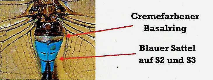Die Abdominalsegmente S2 und S3 haben oben und an den Seiten einen blauen Sattelfleck. (s. Ausschnittvergrößerung)