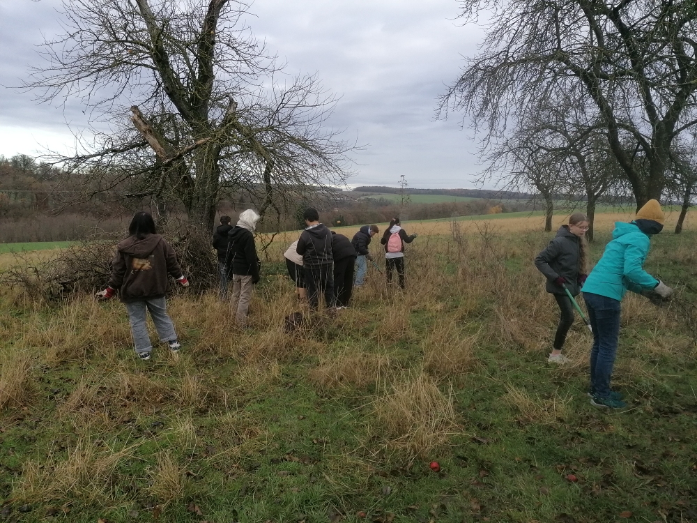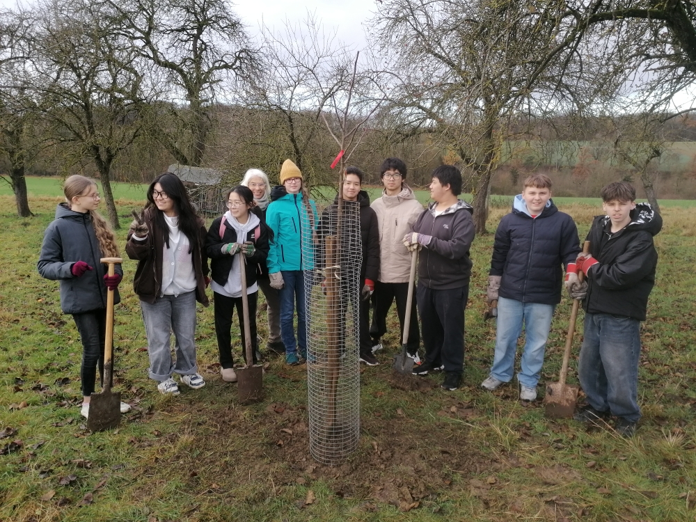 Im Rahmen von BNE (Bildung für nachhaltige Entwicklung), das als Querschnittsthema in den Bildungsplan des Gymnasiums integriert ist, besuchte die „Nachhaltigkeitsgruppe“ der 8. Klasse der SSK unter der Leitung von Andrea Vollrath den NABU Kirchberg. Nach einer theoretischen Einführung zum Thema „Nachhaltigkeit“ pflanzten die Schüler einen Obstbaumhochstamm auf einer Streuobstwiese und befreiten dann eine Wiesenfläche von wilden Zwetschgen. So konnten sie an diesem Nachmittag durch praktische Arbeit einen Bezug zu ihrem Thema herstellen.