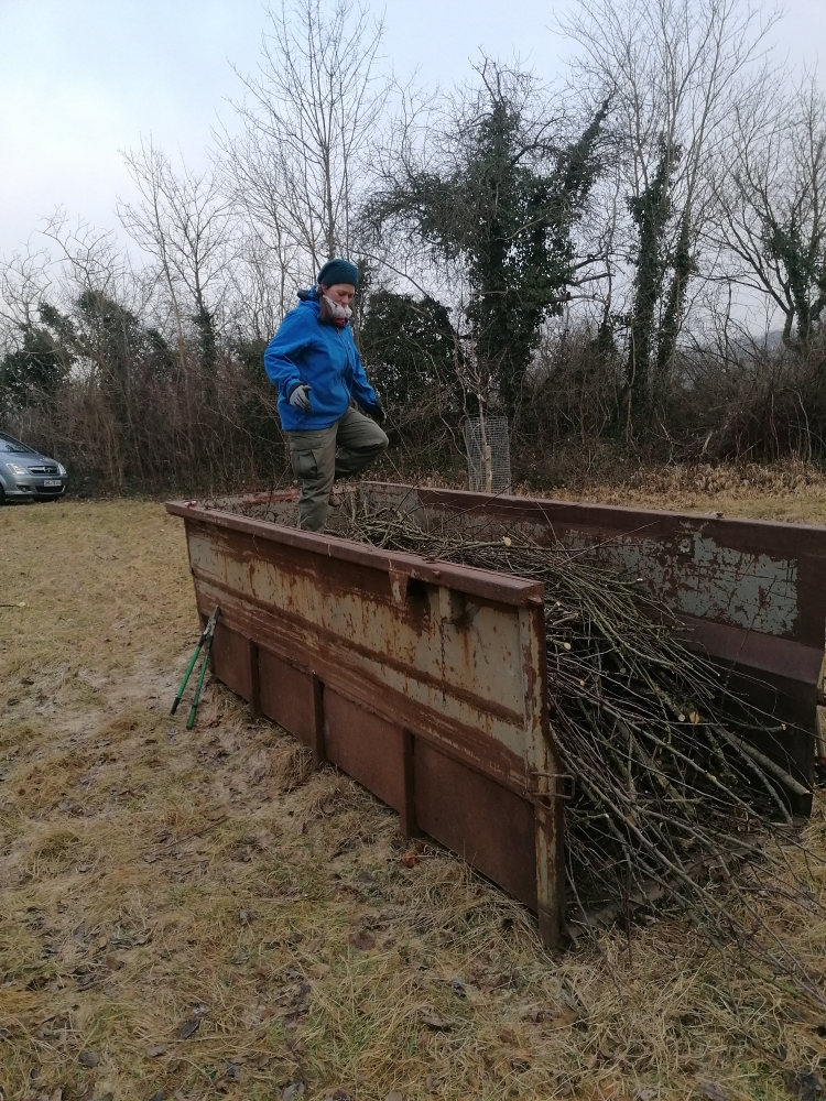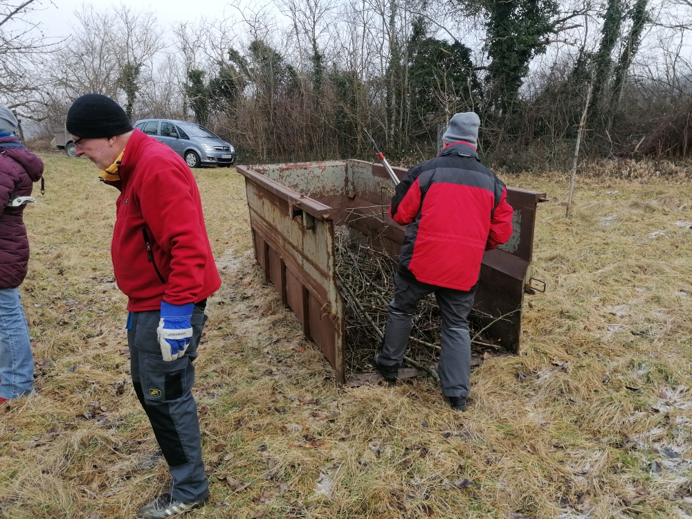 Bei winterlichem Wetter trafen sich 14 Mitglieder des NABU Kirchberg auf der kleinen Streuobstwiese des NABU zwischen Sophienberg und Wanderparkplatz, um den alljährlichen Pflegeschnitt durchzuführen. Unter der Anleitung von Roland Roll wurden etliche Bäume geschnitten, und das Schnittgut wurde gleich in einen Container geladen, so dass es der Verwertung zugeführt werden kann.